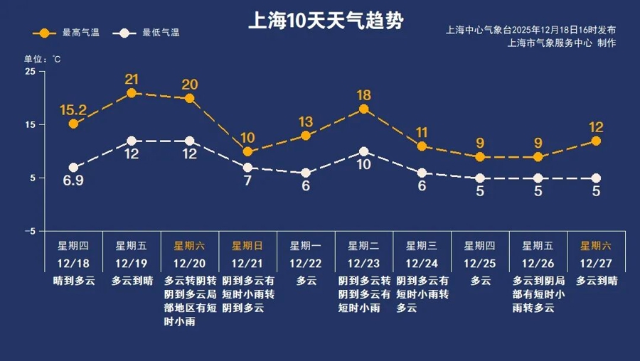 今天(12月18日)早晨气温依然偏低,市区徐家汇站6.9℃,部分郊区仍在冰点以下。但白天晴到多云,阳光助力下升温迅速,最高气温升至15.2℃,午后体感暖洋洋。
