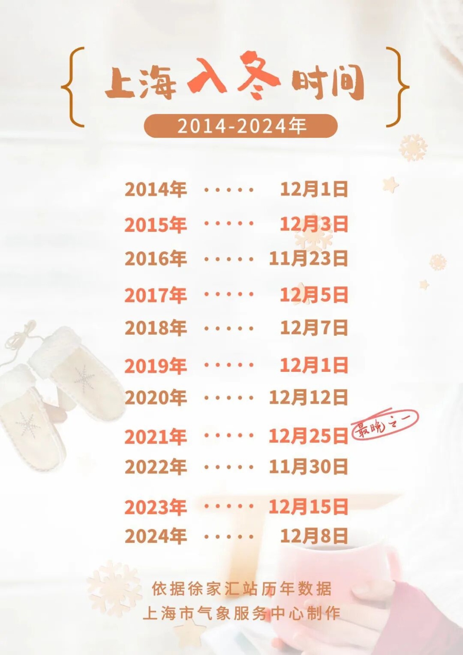 上海常年(1991-2020年)平均入冬时间为12月5日。而今年至今仍未入冬,已经明显偏晚。回顾近十年数据,最早的入冬日是2016年11月23日,最晚是2021年12月25日。